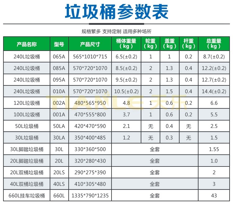 隨著垃圾分類在全國各大城市強(qiáng)制實(shí)施、農(nóng)村人居環(huán)境綜合整治、城鄉(xiāng)清潔工程的實(shí)施以及國家鼓勵(lì)“地?cái)偨?jīng)濟(jì)”政策,垃圾桶產(chǎn)品將迎來無限商機(jī),環(huán)衛(wèi)局、環(huán)保局、城市管理局依據(jù)多年城市環(huán)境治理經(jīng)驗(yàn),相繼會(huì)投入更多的垃圾桶參與環(huán)境衛(wèi)生治理!為此,山東天樂塑料科技有限公司生產(chǎn)的240L/120L/100L/50L/30L環(huán)衛(wèi)分類垃圾桶;40L/20L雙桶(雙胞胎)垃圾桶;智能垃圾桶;660L掛車?yán)暗认盗挟a(chǎn)品,可以更好助力城市鄉(xiāng)村垃圾分類及城鄉(xiāng)生活環(huán)境,幫助解決地?cái)偨?jīng)濟(jì)帶來的城市環(huán)境衛(wèi)生問題。