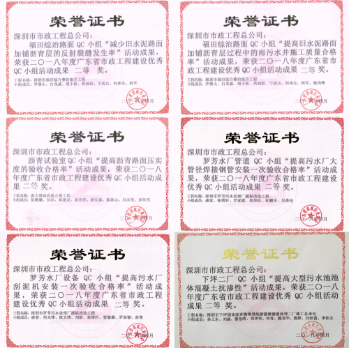 二等獎:《減少舊水泥路面加鋪瀝青層的反射裂縫發(fā)生率》、《提高舊水泥路面加鋪瀝青層過程中的雨霧水井施工質(zhì)量合格率》、《提高瀝青路面壓實度的驗收合格率》、《提高污水廠大管徑焊接鋼管安裝一次驗收合格率》、《提高污水廠刮泥機安裝一次驗收合格率》、《提高大型污水池池體混凝土抗?jié)B性》