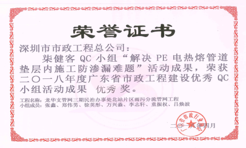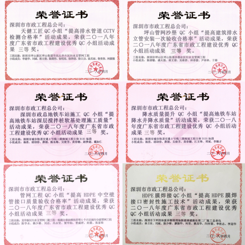 三等獎:《提高HDPE膜焊接口密封性施工技術(shù)》、《提高HDPE中空壁管接口質(zhì)量驗收合格率》、《提高地鐵車站降水井降水質(zhì)量》、《提高建筑排水立管安裝一次驗收合格率》、《提高地鐵車站深層攪拌樁軟基處理施工質(zhì)量》、《提高排水管道CCTV檢測合格率》