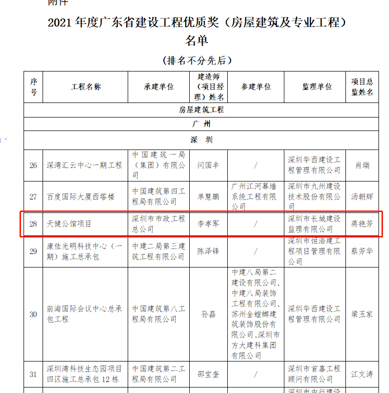 廣東省建設(shè)工程優(yōu)質(zhì)獎(jiǎng)是廣東省建筑行業(yè)工程質(zhì)量的最高榮譽(yù)獎(jiǎng),由廣東省建筑業(yè)協(xié)會(huì)組織實(shí)施,每年評(píng)選一次。評(píng)選對(duì)象為中國(guó)建筑施工企業(yè)在廣東省境內(nèi)承包施工的,并已經(jīng)建成投入使用一年,其質(zhì)量達(dá)到省內(nèi)一流水平的各類(lèi)工程。2021年度全省共有112項(xiàng)工程通過(guò)評(píng)審,其中深圳市有17項(xiàng)工程被評(píng)為2021年度廣東省建設(shè)工程優(yōu)質(zhì)獎(jiǎng)。