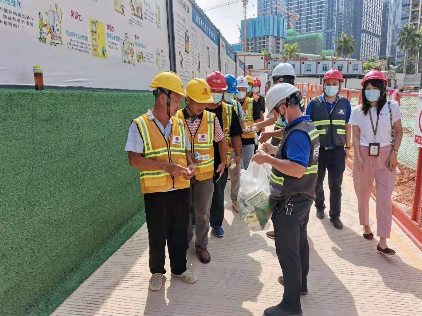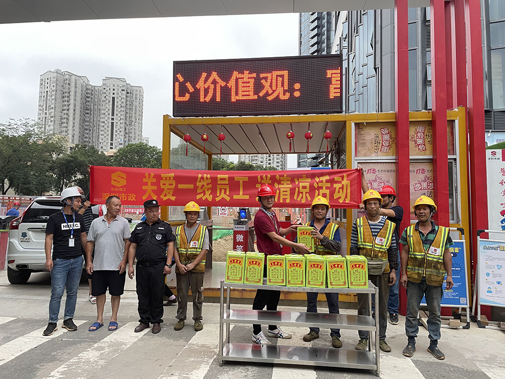 6月4日上午,桂花路停車場(chǎng)綜合體項(xiàng)目為項(xiàng)目一線勞務(wù)人員送上涼茶等防暑物資。