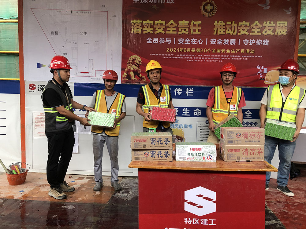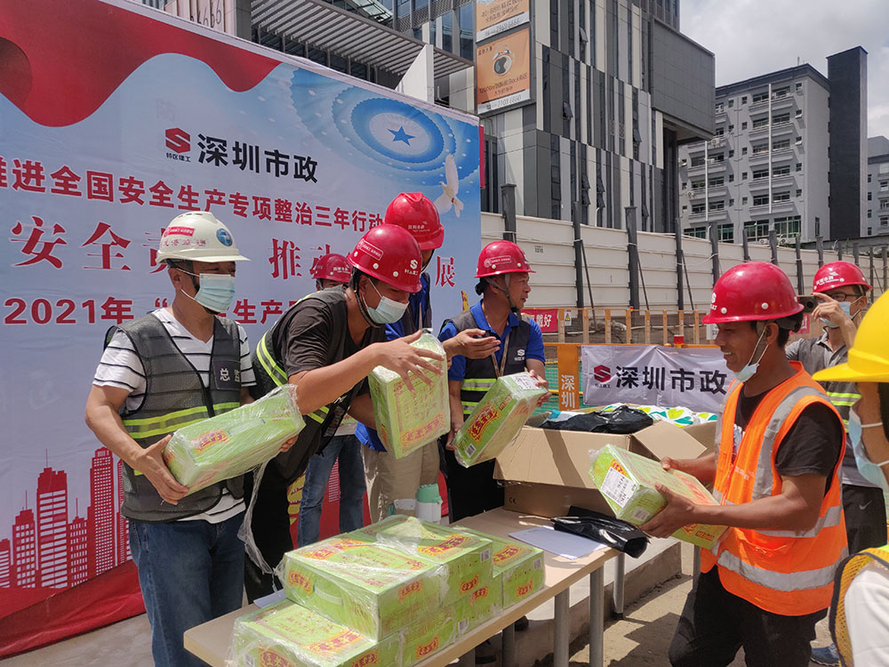 6月7日晚,深圳市第二十一高級(jí)中學(xué)項(xiàng)目部為全體管理人員、產(chǎn)業(yè)工人和后勤保障人員,送去清涼解暑飲品、洗衣液、洗發(fā)水、沐浴露、毛巾等物品。