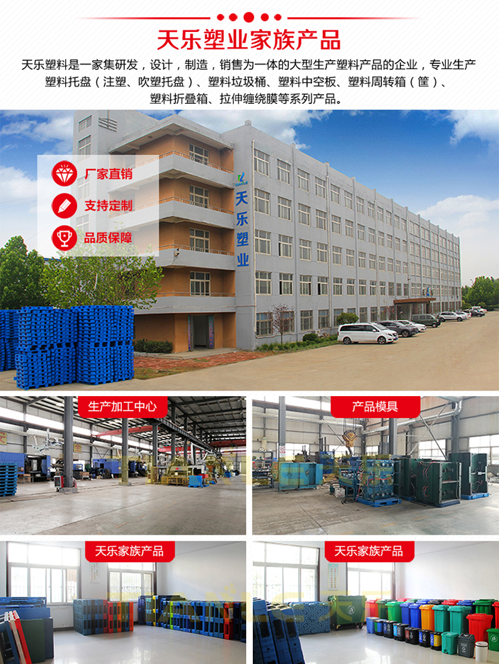 山東天樂塑料科技有限公司是一家集研發(fā),設(shè)計(jì),制造,銷售為一體的大型生產(chǎn)塑料產(chǎn)品企業(yè),公司擁有大型注塑、吹塑成型設(shè)備十多臺(tái),擁有經(jīng)驗(yàn)豐富的設(shè)計(jì)研發(fā)團(tuán)隊(duì),可提供產(chǎn)品定制服務(wù)。專業(yè)生產(chǎn)塑料托盤(注塑、吹塑托盤)240L、120L、100L、50L、30L塑料垃圾桶、40L、20L雙胞胎(雙桶、干濕分離)垃圾桶、660L掛車?yán)?、智能垃圾桶、塑料周轉(zhuǎn)箱(筐)、塑料折疊箱、PP中空板、拉伸纏繞膜等系列產(chǎn)品。垃圾桶產(chǎn)品適用于城市街道、小區(qū)物業(yè)、學(xué)校醫(yī)院、各類公共廣場、餐飲飯店、夜市大排檔、鄉(xiāng)鎮(zhèn)環(huán)衛(wèi)、市政環(huán)衛(wèi)、工廠企業(yè)、花園公園、車站碼頭、風(fēng)景名勝區(qū)等場所。塑料托盤適用于倉儲(chǔ)物流、電商快遞、食品醫(yī)藥、糧油面粉、煙酒飲料、商場超市、印刷印務(wù)、電子電器、化工化肥、服裝紡織、汽車汽配、五金工具、重工機(jī)械等行業(yè)。塑料垃圾桶產(chǎn)品適用于城市街道、小區(qū)物業(yè)、商業(yè)樓宇、星級賓館、學(xué)校醫(yī)院、各類公共廣場、餐飲飯店、夜市大排檔、鄉(xiāng)鎮(zhèn)環(huán)衛(wèi)、市政環(huán)衛(wèi)、工廠企業(yè)、花園公園、車站碼頭、風(fēng)景名勝區(qū)等場所。